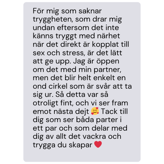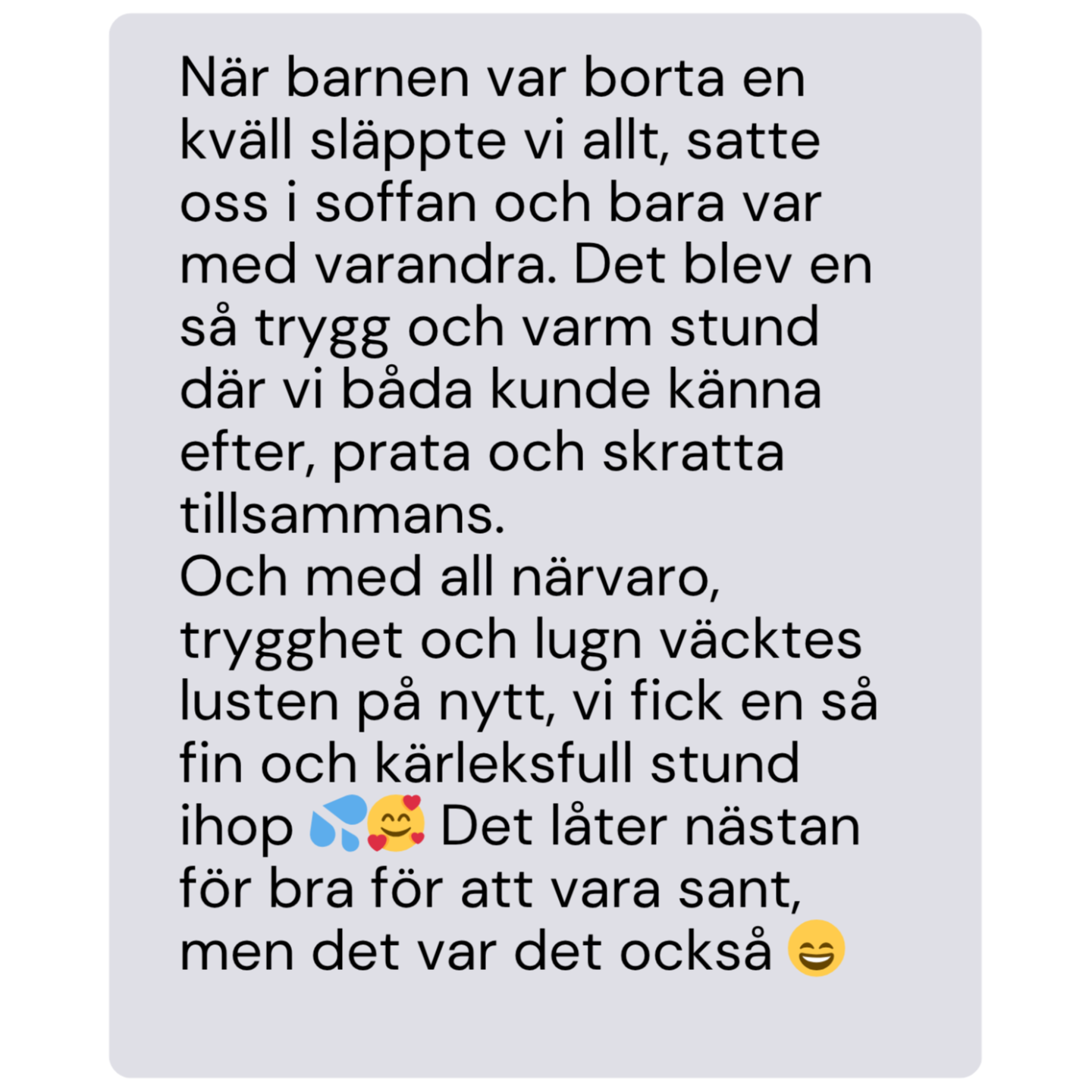 Du kommer att märka hur något sker i dig när din partner håller rummet för dig utan press eller förväntningar. När du känner dig trygg börjar lusten växa igen – på riktigt.